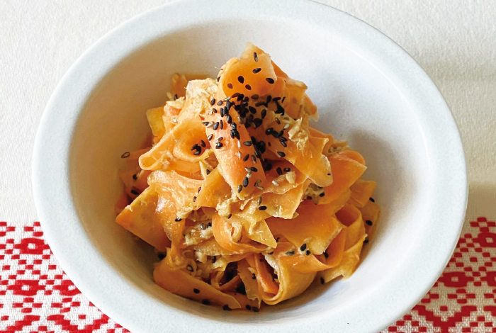 にんじんは皮を剥き、ピーラーで縦にスライスする