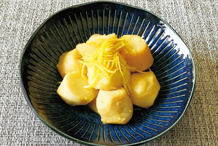 ⑤にBを加えて落し蓋をし、さといもが柔らかくなるまで煮たら火を止めて、②のすりおろしたゆずを加えて混ぜ合わせる