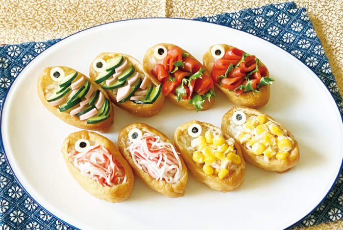 ②の汁気を軽く絞って、中に⑧を詰め、開き口を上に向け鯉のぼりに見立てて③、④、⑤をそれぞれにトッピングし、⑥を上にのせる