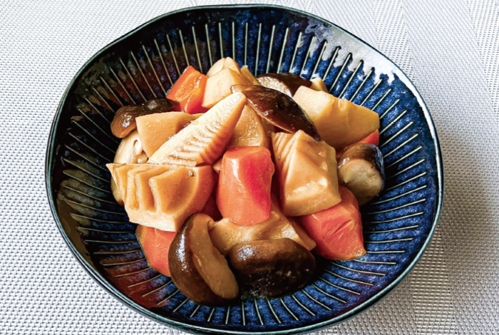 たけのこはひと口大の乱切りに、にんじんは皮を剝いて乱切りに、椎茸は軸を取り、半分のそぎ切りにする