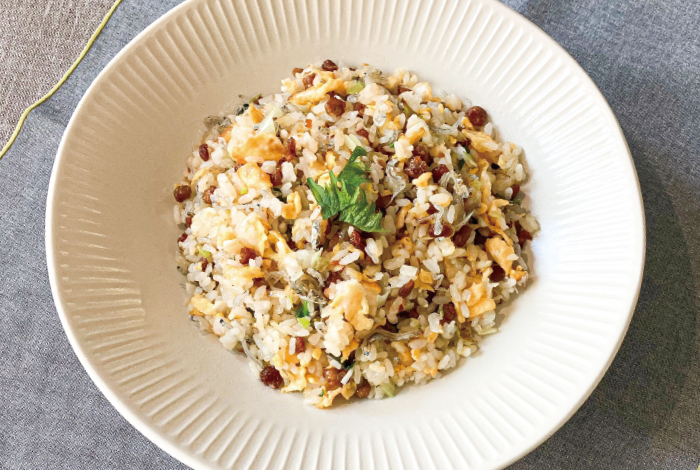 ③のご飯がパラパラになったらAを入れて混ぜ、②と①の大葉を加えて炒め合わせる
